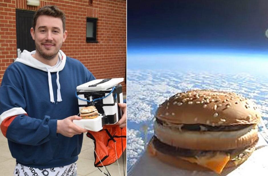 Ютубер Том Стэнлэнд решил снять видео о том, как отправить гамбургер во вселенную и укусить его, как только он упадет на землю. Поэтому он приготовил специальную полистирольную коробку для посуды и прикрепил к ней камеру и GPS-локатор. Затем коробка зацепилась за метеорологический шар, который поднял его на высоту 38 километров, после чего он лопнул.