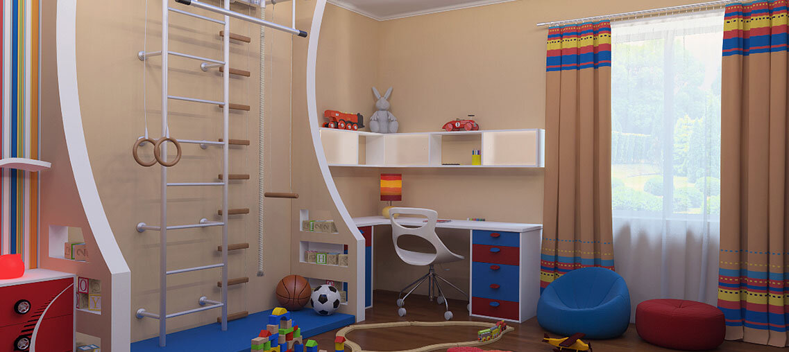 При наличии свободного места не лишним будет спортивный уголок и зеркало, чтобы ребенок мог видеть себя со стороны во время занятий. Если для девочки будет достаточно ковра и небольшой шведской стенки для занятий гимнастикой, то для мальчика можно оснастить стенку кольцами, канатом и лестницей, чтобы он мог укрепляться физически не только на уроках физкультуры, но и дома.