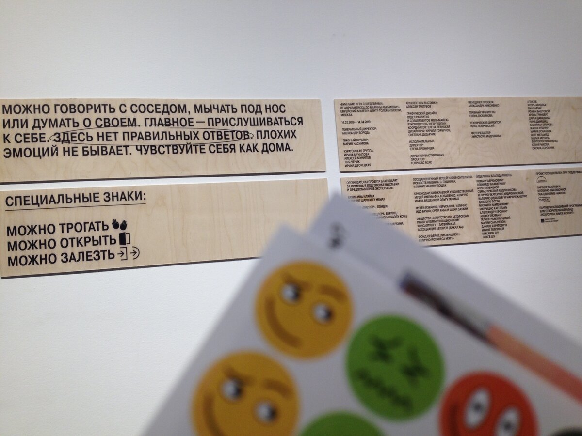 «Игра есть воображение в действии» (из кн. Л. С. Выготского «Психология развития ребёнка») С древних времён известна формула: «Играя – познаёшь мир». Организаторы выставки в Еврейском музее и центре толерантности, увлекая зрителя в своеобразную игру, предлагают познать мир современного искусства. Но, как и любая игра, музейная игра также связана с эмоциями. Не оспоримый факт, чем увлекательнее игра, тем больше эмоций переживает игрок. Здесь на выставке чтобы познакомиться с шедеврами зрителю предстоит испытать весь спектр эмоций: от грусти и страха до удивления и радости. Экспозиция выстроена так, что вы либо кубарем скатываетесь на встречу с прекрасным, либо оказываетесь в абсолютно пустой комнате с одной лестницей, либо в тесном неуютном пространстве с углами, а затем попадаете то ли в круглое, то ли в квадратное пространство и просто радуетесь, услышав звуки беззаботного джаза. Чтобы увидеть шедевры, нужно приложить немало усилий. Некоторые из них вообще спрятаны. Но если вы, н