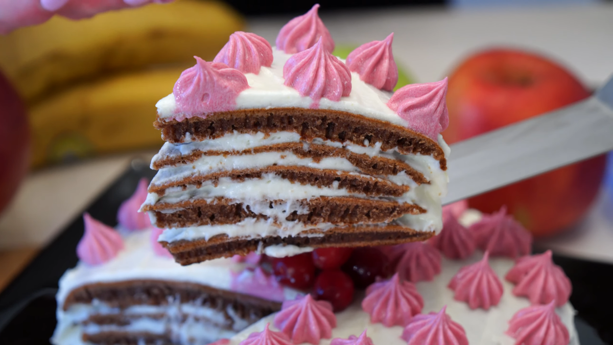 Ванильный сахар 1 ч.л Подробное описание рецепта Взбейте яйца с сахаром в пену. Добавьте растительное масло, молоко комнатной температуры, соль, ванильный сахар и ещё раз взбейте. После чего просейте муку, какао, пекарский порошок (разрыхлитель), тщательно перемешайте. Смажьте сковороду маслом и разогрейте. Равномерно нанесите тесто, готовьте под крышкой 7 минут, а затем переверните на другую сторону, готовьте ещё 3 минуты. Готовим крем. В сотейник выкладываем сметану, сахар, крахмал, разбиваем яйц