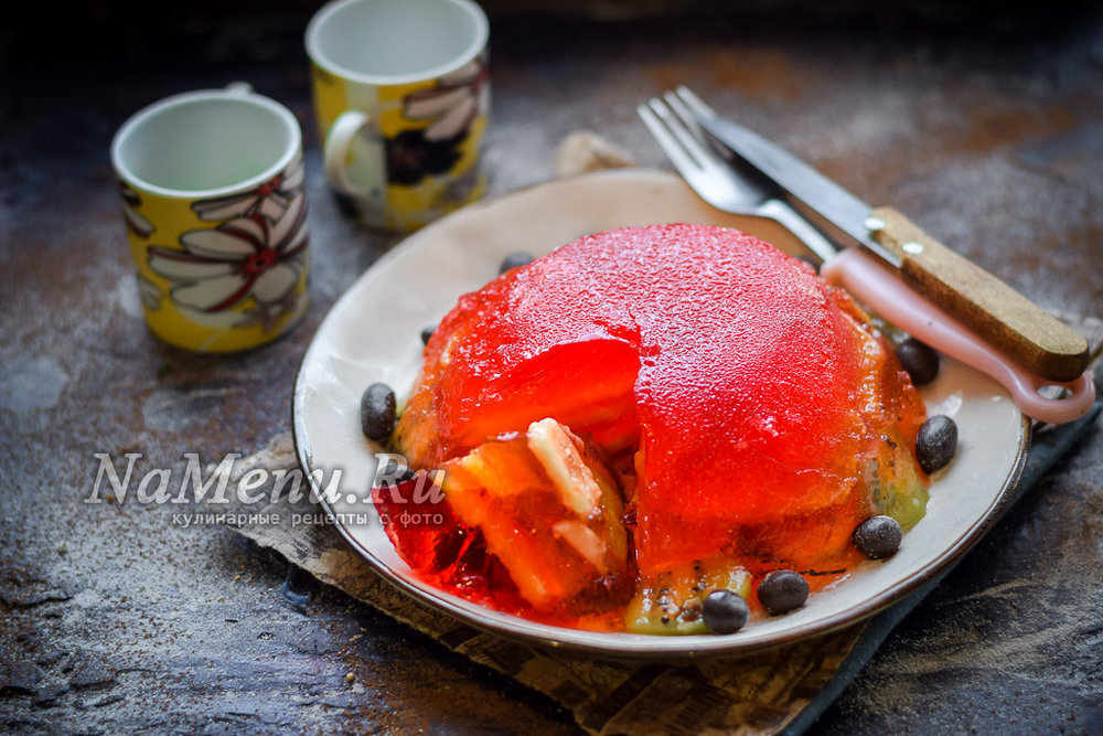 Продукты: - желе – 2 пачки, - бананы – 1 шт., - киви – 1 шт., - апельсины – 1 шт., - вода – 2 стакана 🍊Очистить апельсин и нарезать его пластинами 💧Желе (1 пачку) всыпать в стакан, влить горячую воду и перемешать все, влить в тарелку, разложить кусочки апельсинов ❄️Переставить в холодильник на час 🥝Разложить порезанные пластинами киви и банан, залить второй порцией желе, опять убрать в холодильник 🥣Чтобы достать торт из формы, опустите форму в горячую воду на пару секунд, после извлеките https://namenu.ru/10642/Tort_s_zhele_i_fruktami/