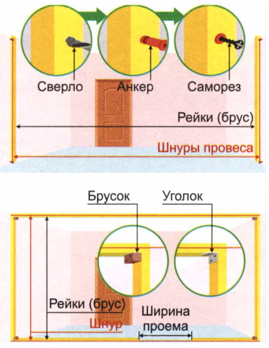 Каркасную перегородку обычно возводят в доме с деревянными стенами и обшивают вагонкой или профилированным строганым пилолесом. Не можно соорудить в квартире, доме с бетонными и кирпичными стенами и облицевать в том числе гипсокартоном или стеновыми панелями. В зависимости от планируемой толщины перегородки допустимо использовать пиломатериал от реек 30x40 мм до бруса 50x150 мм. Инструменты и материалы для работы: карандаш, рулетка, отвес, разметочный шнур или леска, дрель или перфоратор, шуруповерт, ножовка или электропила, стусло или лобзик, молоток. Каркасно-обшивные перегородки с утеплителем своими руками По шнурам провеса к стенам крепим рейки (брус) дюбель-гвоздями. Между верхними и нижними концами реек натягиваем шнуры, по которым прикручиваем еще пару реек к полу и потолку, заложив место для дверного проема. Углы реек сплачиваем с помощью брусков или уголков. Из реек (бруса) формируем проем по внешним габаритам дверной коробки, установив стойки и соединив их перекладиной. Затем