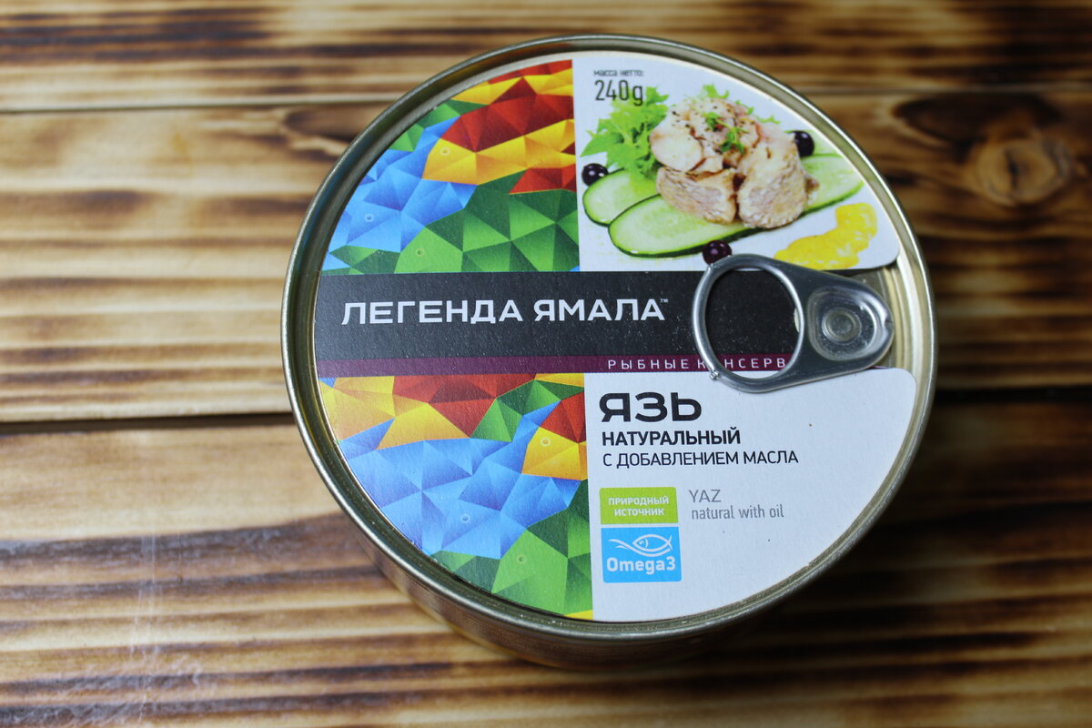Куплена в магазине сети "Магнит" по акции за 55, 90. Цена без акции 96 рублей, что несколько дороговато за баночку весом 240 грамм. Банка с кольцом, этикетка красивая, дизайн на уровне. Шрифт на этикетке очень мелкий, читается с трудом. Язь натуральный с добавлением масла. Состав: рыба, масло растительное подсолнечное, соль поваренная пищевая, перец душистый горошек или его экстракт. К ингредиентам консервов претензий нет, использованы только натуральные продукты. Энергетическая ценность - 265 ккал на 100 грам продукта. Срок хранения 2 года со дня выпуска. Масса нетто - 240 грамм. Производитель ООО"Салехардский комбинат", Тюменская обл, ЯНАО, г Салехард. Банка плотн