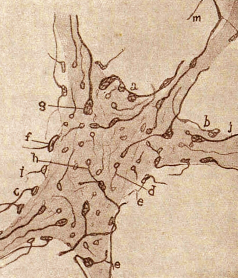 Перед вами — очередной аргумент Сантьяго Рамон-и-Кахаля в вечном, кажется, его споре с Камилло Гольджи. Суть спора была проста: представляют ли собой нейроны единые клетки или это — сплошная сеть. Спор нейронной и ретикулярной теорий строения нервной системы не прекратился даже с присуждением главным спорщикам Нобелевской премии в 1906 году: в своей Нобелевской лекции Гольджи продолжил нападки на оппонента. Здесь мы приводим аргумент Кахаля из книги «Нейронная или ретикулярная» (¿Neuronismo o Reticularismo?), изданной уже после смерти автора (оцифрованный вариант издан Институтом Кахаля в 1952 году и опирается на издание 1933 года). Сам рисунок относится к постнобелевскому времени (1908 год). На нем мы видим поверхность моторного нейрона и дендритные шипики с синапсами — места присоединения к поверхности других нейронов.