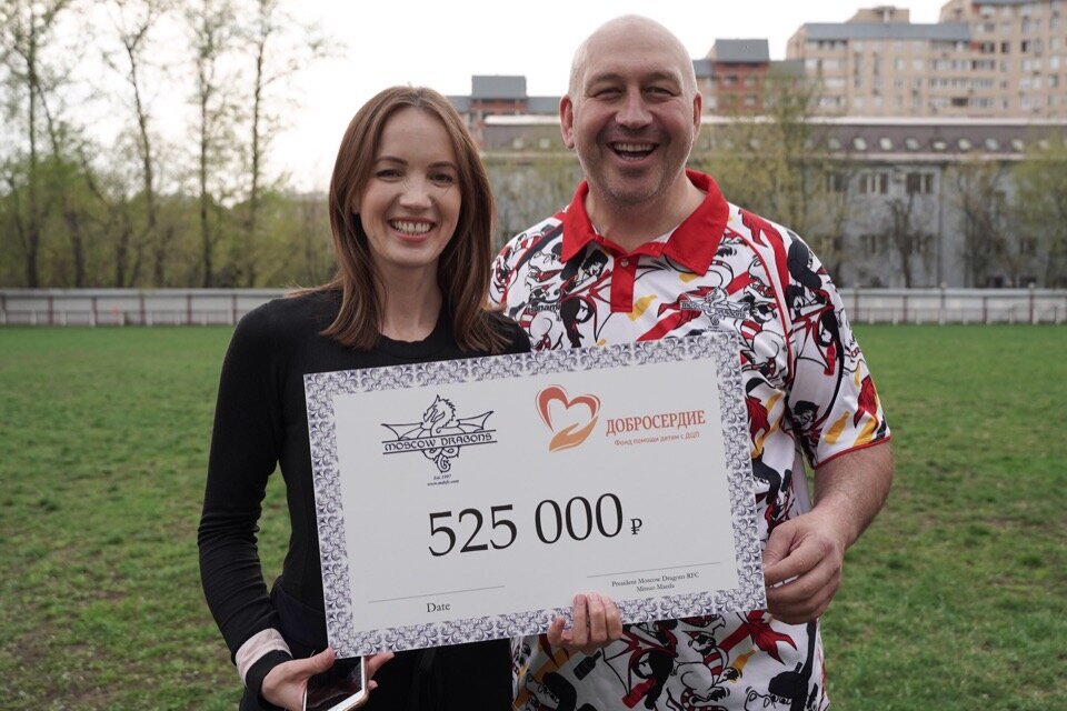 Оберегать слабых и помогать беззащитным – это нормально для сильных и уверенных в себе мужчин. А такими и являются регбисты. Да и как может быть иначе? Ведь представители этой спортивной игры, жесткой, порой жестокой, прекрасно понимают ситуацию, когда боль - не просто неприятные моменты любимого вида спорта, а неотъемлемая часть жизни, от которой невозможно, но так хочется избавиться. Видимо, по этой причине Футбол-регби клуб «Московские Драконы» уже на протяжении многих лет тесно сотрудничает и является официальным партнером Благотворительного фонда «Добросердие». 27 апреля по окончании товарищеского матча между «Московскими Драконами» и РК «Торпедо» игроки и руководители «хищников» передали Президенту благотворительного фонда Надежде Корсаковой символический чек на сумму 525 тысяч рублей. Что же касается самих денежных средств, то они были целенаправленно собраны и переданы фонду в ходе ежегодного благотворительного бала, устраиваемого «Московскими Драконами» в честь Дня всех влюбле