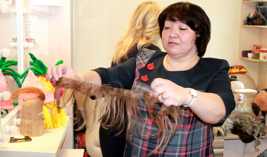 – Один раз нам сказали сделать шевелюру для Водяного, – рассказала Бухановская, – взяли шапочку для бассейна, прикрепили к ней самодельные зелены локоны из ткани, набили их утеплителем. Получилось что-то вроде водорослей, – рассказала посетителям экскурсовод. – А вот этот старый паричок потрогайте! Он сделан из парчи. Распустили и заново сплели, процесс очень кропотливый, зато все получилось так, как задумывал художник. Если режиссер просит максимально натурального эффекта, мы делаем шиньоны и парики из настоящих волос.