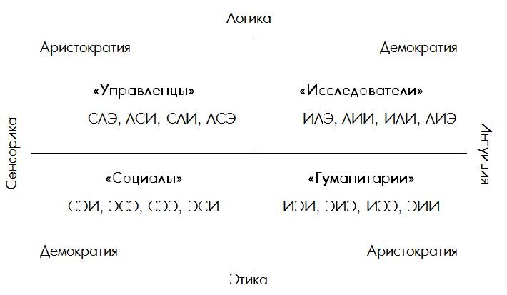 Очень важным моментом в определении социотипа является диагностика установки на вид деятельности. Можно выделить четыре таких установки, образующихся путем пересечения юнговских шкал „логика - этика" и „сенсорика - интуиция":