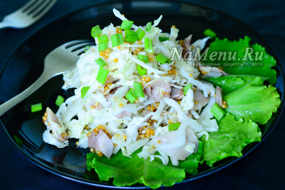 Продукты: 🐓Отварите мясо в подсоленной воде и нарежьте крупными кусками 🔪Капусту нашинкуйте, добавьте горчицу 🌻Влейте масло и уксус. Перемешайте https://namenu.ru/10953/Dieticheskij_salat_iz_kapusty/