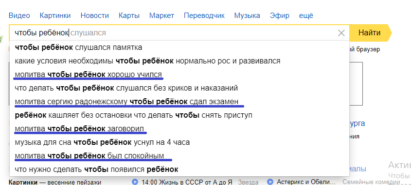 Все знают, что при вводе в поисковик каких-то слов, всегда выдаётся топ наиболее популярных запросов людей, которые вводили эти слова. Теперь давайте узнаем, что нам выдаст поисковая система Яндекс при вводе двух слов "чтобы ребёнок" . Результат шокирует многих: смотрите сами список этого мракобесия. Таким образом, люди целенаправленно ищут молитвы, чтобы ребёнок: К любой религии стоит относится уважительно и терпимо, ведь она является частью культуры целых народов. Но когда при помощи молитвы хотят решить такие пробелы в воспитании и обучении детей - это, товарищи, уже полное мракобесие. Хочешь, чтобы ребёнок хорошо учился? Помоги. Хочешь, чтобы хорошо сдал экзамен? Мотивируй и участвуй. Хочешь, чтобы ребёнок заговорил? Разговаривай. Хочешь, чтобы был спокойным? Выясни, что не так. Интересно было бы услышать глас тех, кто это осуществил: пошёл в церковь или храм, поставил свечу и отчитал зазубренную молитву. Это реально работает? Ребёнок реально стал говорить, хорошо учиться, сдал экз