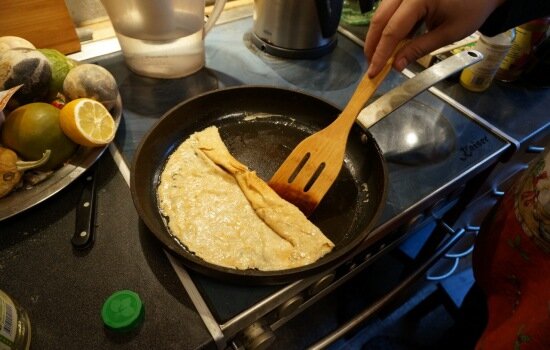 - Рано перевернули. Блин обязательно порвется, если он еще не готов. Переворачивать нужно только тогда, когда сверху на тесте появятся дырочки, оно слегка подсохнет.