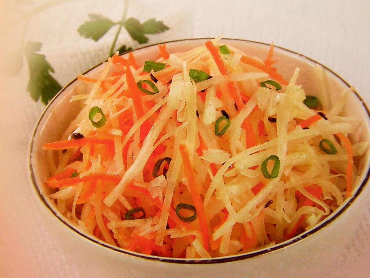 Салат из редьки с сыром. Редьку две штуки, морковь одна штука и 200 г твёрдого сыра натрите на крупной терке, перемешайте, посолите и добавьте измельченный зелёный лук, тмин и заправьте растительным маслом и майонезом