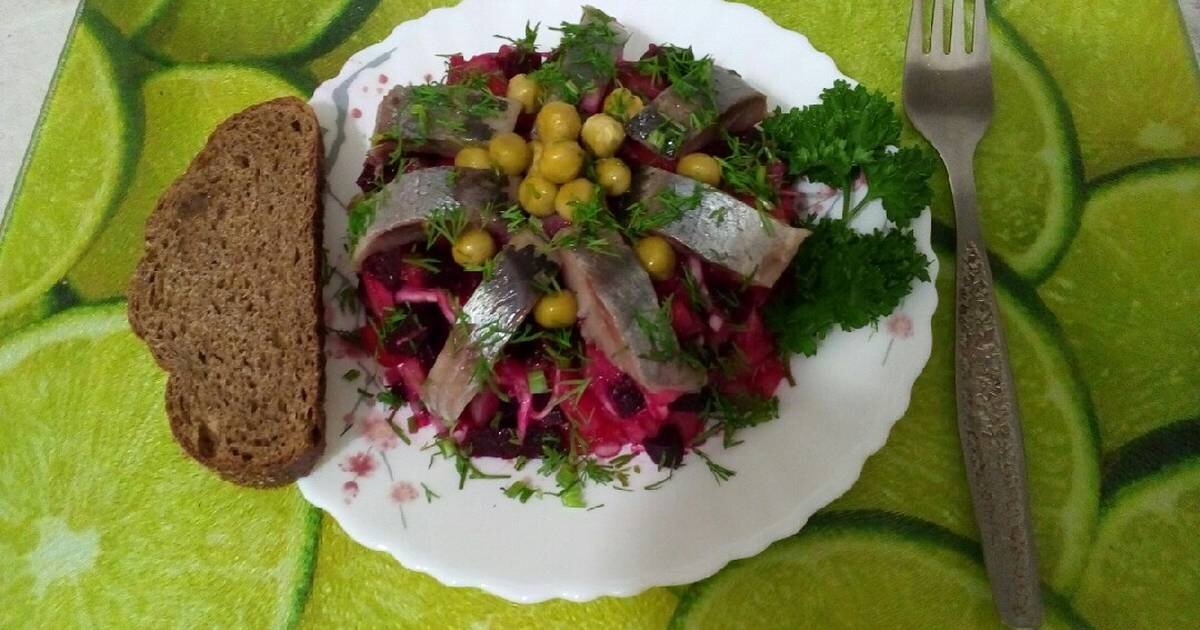 Винегрет с сельдью. 40 г морковки, 300 г картофеля, 40 грамм свеклы отворите в кожуре, охладите очистите, нарежьте кубиками. Так же измельчитель солёные огурцы. В течение 6часов вымочить сельдь 300 г, разделите ее отделите филе и нарежьте его кусочками. Подготовленные овощи заправьте салатной заправкой или майонезом со специями, выложитк в салатник, а сверху разложите кусочки сельди, дольки яиц и зелень. Для заправки можно использовать жир из шпротов, сайры и др.