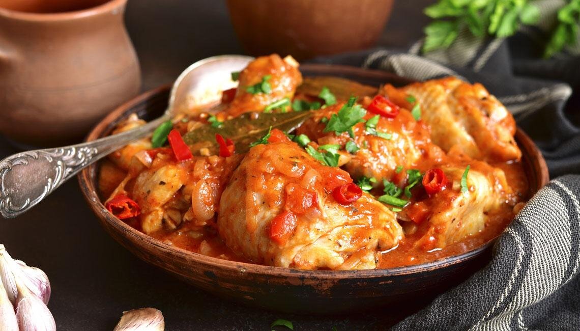 Чахохбили. Обработанная курицу разрубить на небольшие кусочки и обжарьте в неглубокой кастрюли на масле, добавьте измельченный лук 2 штуки, две столовые ложки томатного пюре, одну столовую ложку уксуса. Влейте две столовые ложки крепленого вина( портвейна. мадера), 0,5 стакана бульона посолить и поперчить и всё вместе тушить в духовке под крышкой на слабом огне в течение 1,5ч.