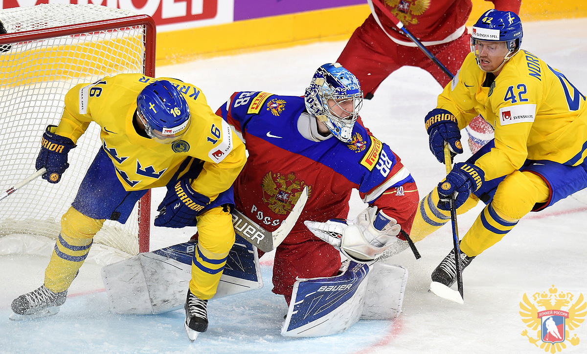 Завершился матч между сборными командами Швеции и России. Первый период В первом периоде Сборная Швеции забила быстрый гол на третьей минуте(1:0). По ходу периода команды по одному разу попытали удачу в большинстве. Под занавес периода сборная России восстановила равенство в счёте, на 19-ой минуте ворота Маркстрёма поразил Александр Елесин, ассистировали ему Никита Гусев и Евгений Малкин(1:1). Второй период Второй период начался сразу с двух шайб Шведов. На 20 секунде второго периода Евгений Малкин за игру высоко поднятой клюшкой отправился на скамейку для "плохих" парней (Двойной малый штраф 2+2), спустя 37 секунд Шведы забивают гол и выходят вперёд (2:1). В начале четвертой минуты ворота Василевского поразил нападающий Чикаго Маркус Крюгер (3:1). В середине второго периода отставание сократил Сергей Андронов, ассистировали ему- Сергей Плотников и Никита Гусев.(3:2). За 2:27 до конца 2-го периода команда сборной России осталась в меньшинстве, целая минута была у сборной Швеции чтобы