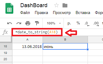 Функция извлекает из даты значение Месяц и переводит его в текстовое значение прописью. Сначала создаем сценарий как здесь, далее создаем функцию. function date_to_string(_date) { // --- Массив со значениями месяцев var _arr_months = new Array('январь', 'февраль', 'март', 'апрель', 'май', 'июнь', 'июль', 'август', 'сентябрь', 'октябрь','ноябрь','декабрь'); // --- Переменная для хранения Даты переданной функцией var _date = new Date(_date); // --- Переменная для сохранения имени месяца var _string = ''; // --- Проверяем если пустое значение даты, то завершаем и возвращаем false if (!_date || _date == 0) return false; // --- Получаем значение месяца в виде числа и достаем из массива его текстовое значение _string = _arr_months[_date.getMonth()]; // --- Возвращаем найденное значение return _string; } После сохранения сценария можно использовать функцию
