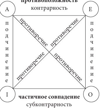 Итак, перед нами логический квадрат. Мы видим по его углам какие-то буквы. Сейчас объясню, что все это означает. Каждая буква - тот или иной вид суждения, а сам квадрат показывает отношения между ними. Между А и Е это отношения противоположности, между А и I, а также Е и О - подчинения, между А и О, а также Е и I - противоречия, между I и О - частичное совпадение. На квадрате это отлично видно.