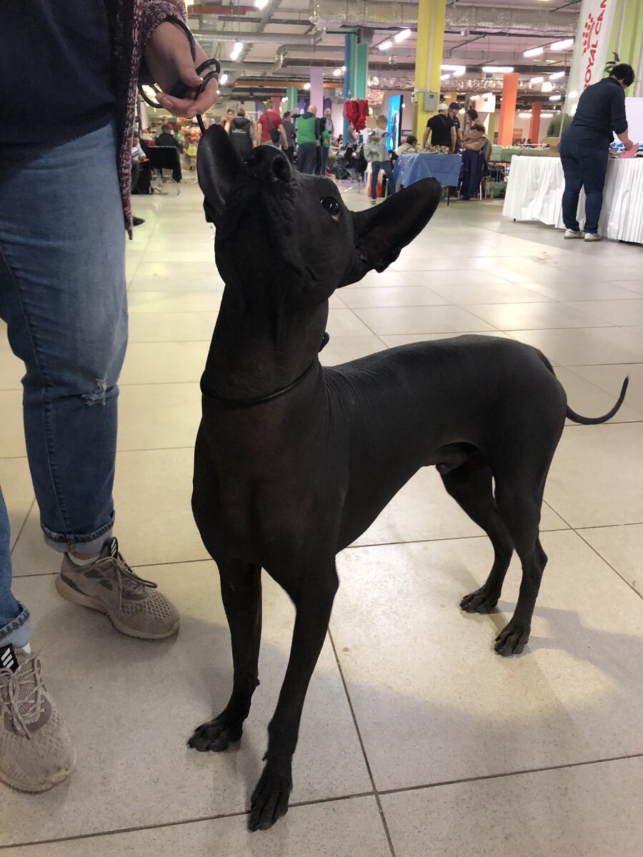 Существуют породы мимимишные (бишон фризе, например), а есть — на любителя. Для меня такими были голые собаки. Но в конце апреля на выставке мы познакомились с совершенно очаровательным созданьем породы мексиканская голая собака (официально — ксолоитцкуинтли). Ксоло был грациозен и дружелюбен необычайно, давал себя погладить и мило морщил лоб. Кожа на ощупь была толстой и очень теплой. Ощущение обманчиво, температура тела у этой породы выше, чем у человека, но такая же, как у остальных собак. В древние времена в мексиканской пустыне эти собаки согревали хозяев своим теплом. Оказывается, отсутствие шерсти у мексиканской и перуанской голой, а также китайской хохлатой собак обусловлено генетически и связано также с аномальным отсутствием коренных зубов — всех, кроме резцов. Все три породы относятся к древним и примитивным — созданным без участия человека. В Мексике и Перу признаны национальным достоянием. Ксоло — больше 2000 лет, родом из Америки времен ацтеков и майя. Использовали со