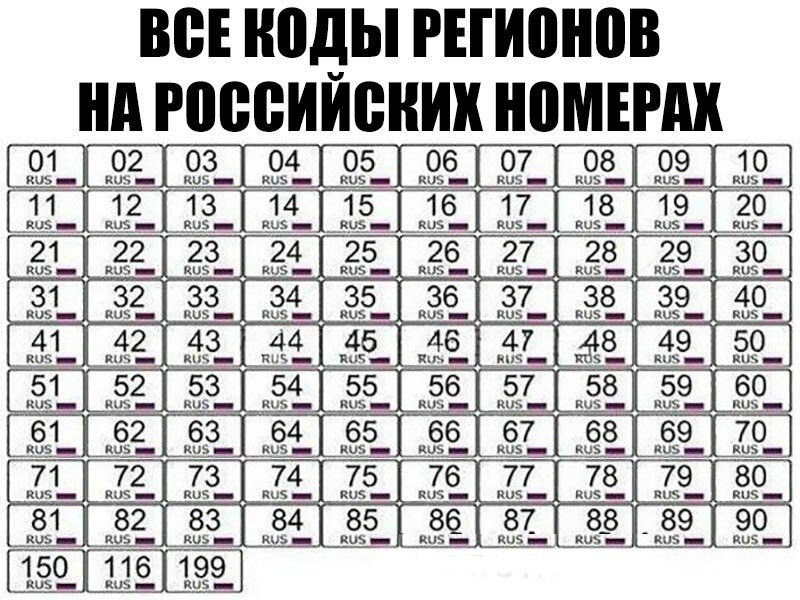 01 - Республика Адыгея; 02, 102 - Республика Башкортостан; 03 - Республика Бурятия; 04 - Республика Алтай (Горный Алтай); 05 - Республика Дагестан; 06 - Республика Ингушетия; 07 - Кабардино-Балкарская Республика; 08 - Республика Калмыкия; 09 - Республика Карачаево-Черкессия; 10 - Республика Карелия; 11 - Республика Коми; 12 - Республика Марий Эл; 13, 113 - Республика Мордовия; 14 - Республика Саха (Якутия); 15 - Республика Северная Осетия — Алания; 16, 116 - Республика Татарстан; 17 - Республика Тыва; 18 - Удмуртская Республика; 19 - Республика Хакасия; 21, 121 - Чувашская Республика; 22 - Алтайский край; 23, 93, 123 - Краснодарский край; 24, 84, 88, 124 - Красноярский край; 25, 125 - Приморский край; 26 - Ставропольский край; 27 - Хабаровский край; 28 - Амурская область; 29 - Архангельская область; 30 - Астраханская область; 31 - Белгородская область; 32 - Брянская область; 33 - Владимирская область; 34, 134 - Волгоградская область; 35 - Вологодская область; 36 - Воронежская область