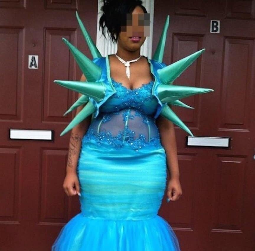 Что вспоминается, когда произносят слова "выпускной вечер" или "выпускной бал"? В большинстве случаев это красивые платья девушек и опрятные костюмы парней, вступающих во взрослую жизнь. Событие это, без сомнения, значимое. И естественно, должно запомниться на всю жизнь. Многие выпускницы и выпускники понимают слова буквально. Перед нами подборка поистине незабываемых нарядов. Будьте осторожны, некоторые из них способны вызвать непредвиденный всплеск эмоций. Вряд ли это будет восхищение, но кто знает... Итак, вот такие платья и костюмы были реально надеты в этот праздник. Синяя роза и ее шипы (главное фото) Удивительный способ, чтобы выделиться. Довольно креативная девушка, и к тому же смелая. Как оригинально она придумала сохранить свое тело от дерзких поползновений перебравших пунша бывших одноклассников. Но они, наверное, и так не подойдут. Камуфляж для вечера Видимо, нужно просто обожать рыбалку и охоту, чтобы нарядиться в такое. Хотя многим может понравиться эта парочка. Как тепе
