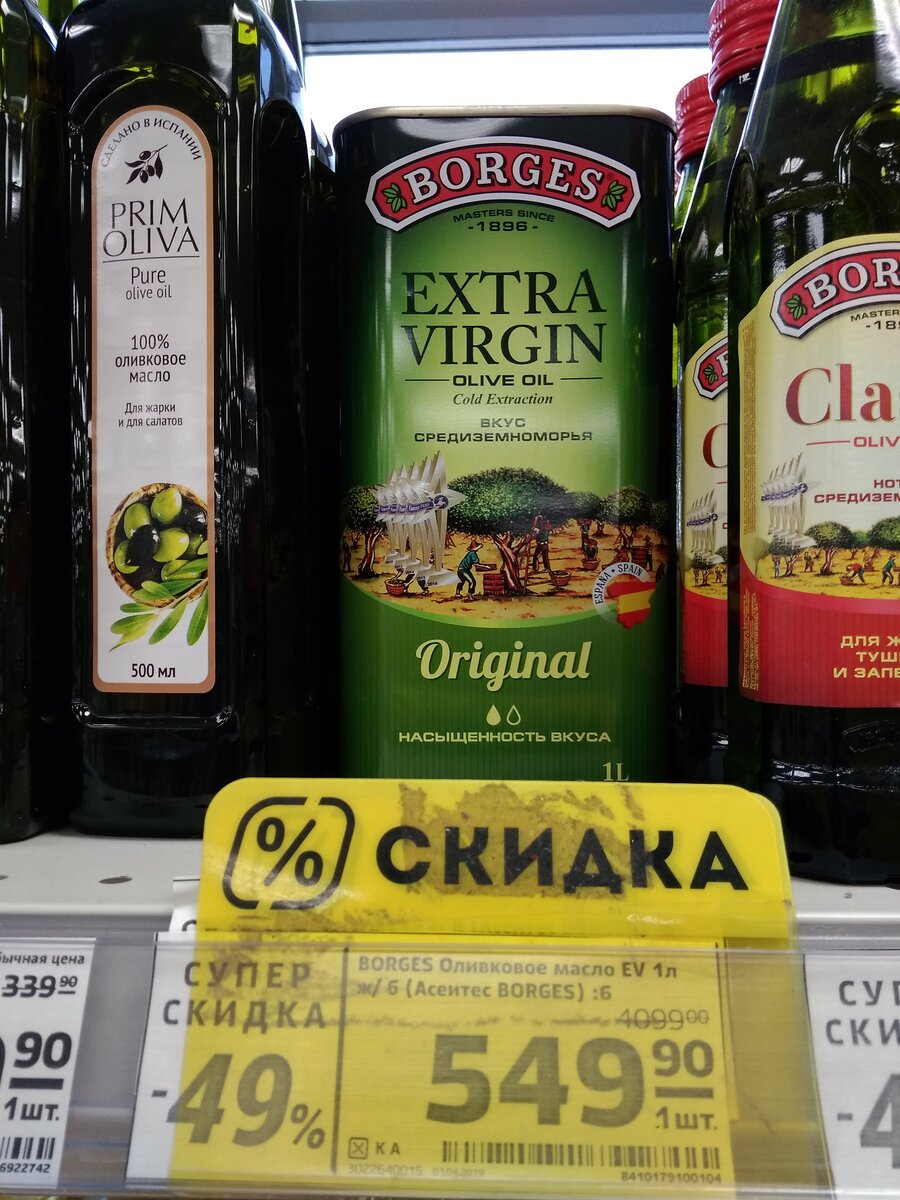 Я специально не охочусь за скидками, это они "охотятся" за мной и моим кошельком. Я совсем не планировала покупать масло, но пройти мимо таких скидок я не могу. А вы сможете? Публикую скидки в "Магнит" на этой неделе на масло до 7 мая включительно. 1. Оливковое масло Extra Vergin Borges. Объем 1 литр. Скидка 49%. Экономия 550р. Именно это масло я не пробовала, но у меня есть настоящее оливковое масло в железной банке, которое мне привезла подруга из Европы. Масло совсем не похоже на то, что продают у нас в магазине. Масло имеет горьковатый привкус зелени. Само по себе оно не вкусное, а вот в салате раскрывается и даёт пикантный вкус. 2. Оливковое масло Classic Borges. Объем 0,25л. (1 литр = 600р). Скидка 49%. Экономия 150р. Лично мое мнение, если выбирать, то всё-таки лучше купить первый вариант оливкового масла в железной банке, так как производитель один и тот же и цена за 1 литр одинаковая. Но будьте готовы, что вкус у масла в железной банке непривычный. 3. Масло оливковое Pu