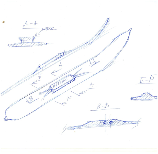 Итак. Дерева изготовлены, как на рисунке. Пáтлас располагается ровно посредине заготовки. Пáтлас еще до подклейки камуса насквозь прибивается гвоздями с прочной шляпкой, спереди и сзади, для того, чтобы он не оторвался. Он это может. Гвоздь загибается и вновь вбивается в деревá - снизу. Шурупы таких гвоздей не заменят. Спуски с пáтласа лучше такого вида, как на рисунке – они не трескаются, в отличии от узких ребер.