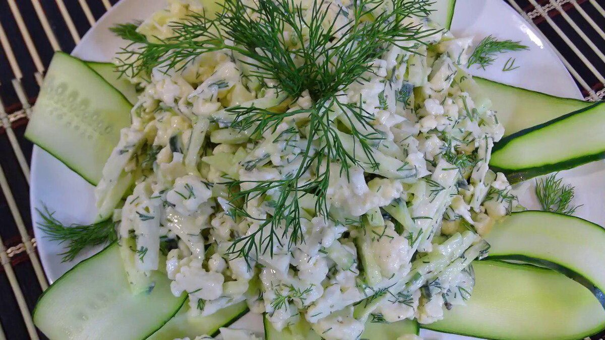 Великолепный простой салат, который вы приготовите всего за 20 минут. В нем кроме капусты имеются огурцы и лук, зеленый укроп, а также заправка, без которой он точно будет не таким вкусным. Ингредиенты · 350г цветной капусты; · 180г свежих огурцов; · 60г репчатого лука; · 5-6г свежего укропа. Заправка: · 70г майонеза; · 70г сметаны; · 1 ст. ложка соевого соуса; · пол ч. ложки соли (по вкусу); · черный молотый перец - по вкусу. Процесс приготовления Для начала подготовьте продукты для салата со цветной капустой. 1. Возьмите тарелку и поместите в нее мелко нарезанную цветную капусту. 2. Огурец также нарезать мелкими кубиками и отправить к капусте. 3. То же самое, что и с огурцами, сделать с репчатым луком, очистив его от кожуры и промыв. 4. Укроп очень мелко нарезать и отправить к салату. 5. Все хорошо перемешать. Добавить сметаны, майонеза и соевого соуса. Снова перемешать салат. По желанию можно посолить и поперчить. Лучше всего сначала смешать отдельно ингредиенты для заправки и от