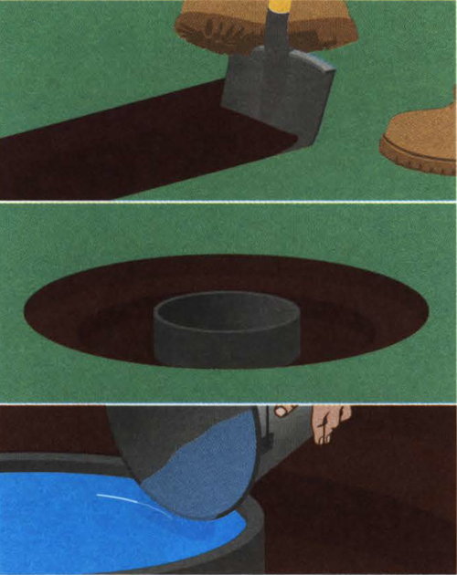 Отрываем круглый котлован в диаметре 1,5-3 м и глубиной около 0,3-0,6 м. Подбираем подходящую пластиковую емкость диаметром до 1 м и вкапываем по центру, выставив по уровню. Далее заполняем водой, чтобы емкость не сдавило подсыпкой.