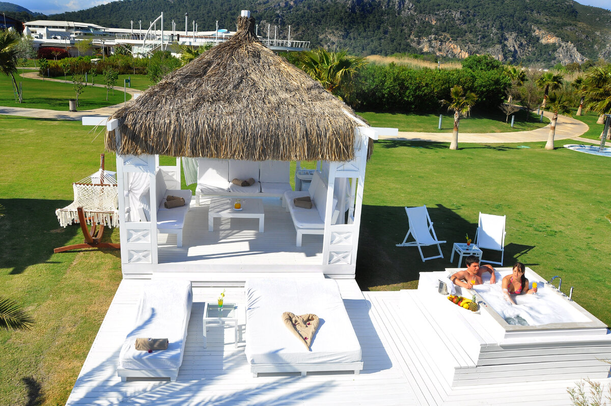 Часть 2. Эгейское побережье Одно из самых живописных направлений в Турции, это пляжи Эгейского моря. Основным нюансом для состоятельных туристов из России это отсутствие прямых регулярных рейсов. На данный момент для этих туристов можно рассмотреть бизнес класс на чартерных рейсах либо рассмотреть отели в регионе города Даламан с перелетом на S7. Для тех, кто готов лететь со стыковкой могут выбрать перелет Turkish Airlines, через Стамбул. Качественный сервис в эконом и бизнес классе, участие в бонусной программе Star Alliance и выбор удобного времени вылета скрасят все неудобства данного типа перелета. 1. HILTON DALAMAN SARIGERME RESORT & SPA Самый ближайший отель к аэропорту Даламана известной мировой цепочки. Так как многие известные отели этой сети работают по франшизе, сервис и уровень может отличаться от других отелей этой сети. Открытие состоялось 2009. Стиль cabinet lounge.