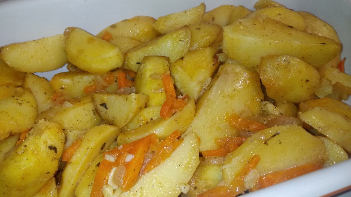 Для тех кто соблюдает пост или сидит на правильном питании рецепт такой картошечки придется по вкусу. Готовится очень быстро Но получается просто пальчики ОБЛИЖЕШЬ! ***************** 💗Маленькая просьба💗 Напишите в комментариях что то доброе или оставьте любой смайлик Для меня это ОЧЕНЬ важно! Я хочу видеть людей которым нравится то что я готовлю💗 **************** На 1 кг картофеля 1 морковь 1 луковица 1 ст л соли 2 зуб чеснока Соль,перец,смесь трав - по вкусу Растительное масло Картошку разрезала на 4 части,морковь соломкой,лук полукольцами,чеснок колечками. Добавила все специи и хорошо перемешала. Высыпала в пакет для запекания и поставила в разогретую до 180 гр духовку на 45 мин. Идеально будет если посыпать свежей зеленью.