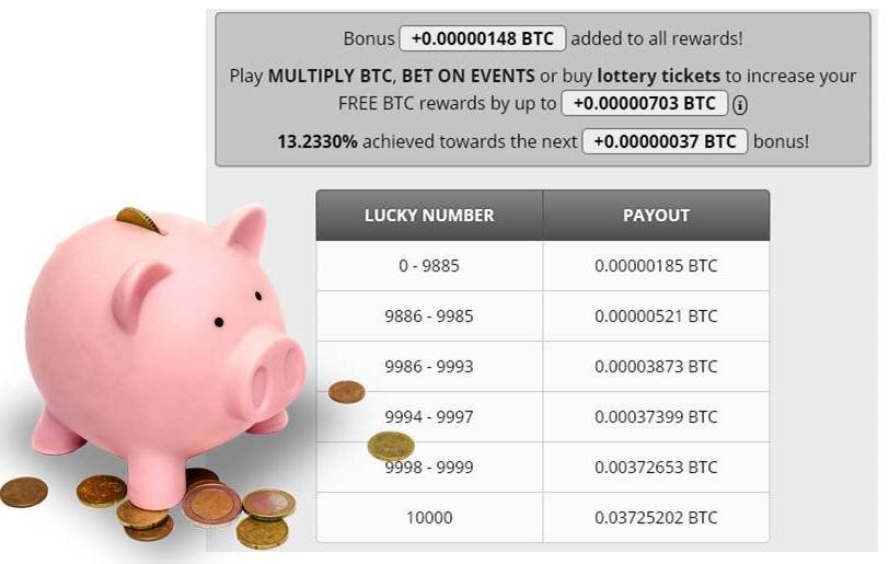 Помимо бесплатных сатош, нажимая кнопку Вы получаете 2 бесплатных лотерейных билета, и 2 бонусных очка.