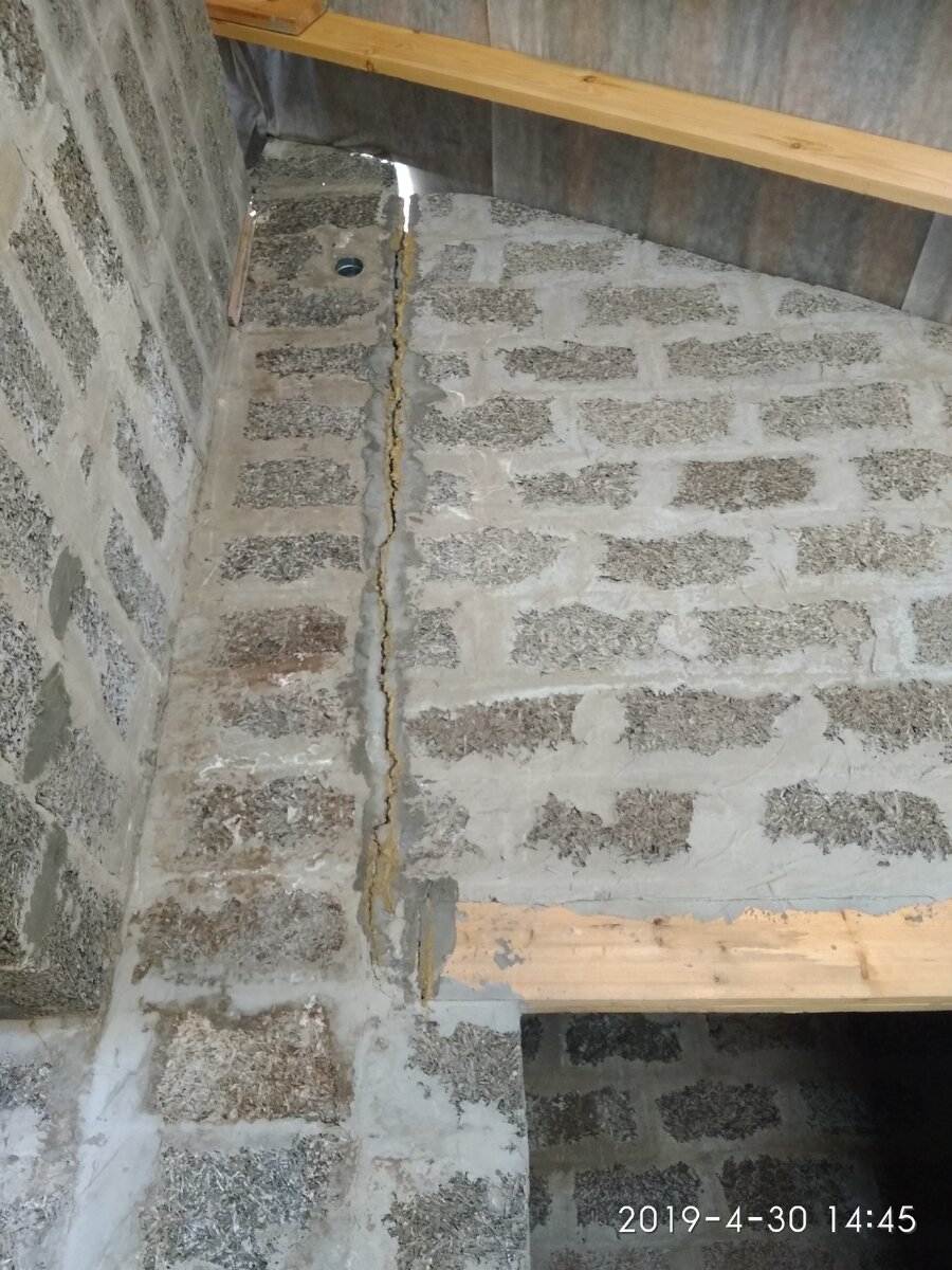 Обследование дома с тремя трещинами в разных местах и по разным причинам продолжается... Первая статья повествовала об ошибке при монтаже 3,5 метровой перемычки, в качестве которой был выбран уголок с полкой 150мм. В этой статье хочу рассказать почему возникла вторая трещина... Как видно на фото с левой стороны идет капитальная стена(в этом месте стена является будущим дымоходом, или вентиляционной шахтой), толщиной 300мм, с правой- помещение просто поделено на два, перегородкой из блоков, толщиной около 150мм. Перемычка выполнена из бруса 100мм, но дело не в ней, а вся изюминка в том, что между блоками перегородки и основной стеной нет никаких связей, только раствор. Трещина образовалась не по всей длине сопряжения стен, а идет сверху и заканчивается почему-то у деревянной перемычки, почему не идет ниже, не понятно. Толи брус усох(в это вериться с трудом) и все опустилось толи еще что-то, но ниже бруса стена без трещин. Вообще нужно было выпустить арматуру(или строительную сетку толщ