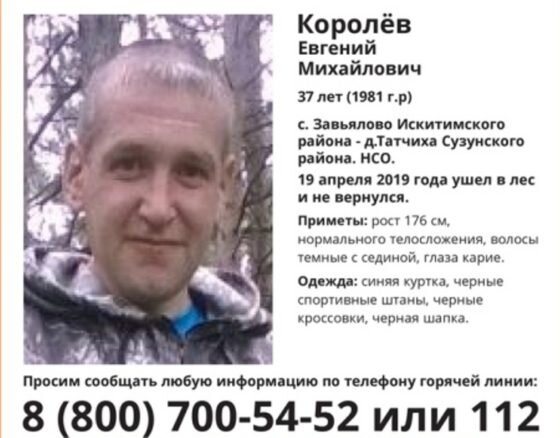 Вечером 2 мая стало известно, что пропавшего две недели назад 37-летнего бердчанина Евгения Королева нашли мертвым. Об этом «Курьер. Среда. Бердск» сообщили знакомые погибшего. — Его родственники рассказали, что нашли погибшим. Пока никаких подробностей нет, — поделились с «Курьер. Среда. Бердск» знакомые Евгения. Как сообщал «Курьер. Среда. Бердск», утром 19 апреля он ушел в лес на охоту в районе с. Завьялово Искитимского района и с тех пор о нем ничего не было известно. Телефон его молчал. Его поисками занимались родные и друзья, сообщившие о произошедшем в полицию. 21 апреля на поиски Евгения вышли волонтеры поискового отряда «Лиза Алерт». Искали в лесу от с. Завьялого до Сузунского района. И вот, спустя две недели обнаружили его тело.