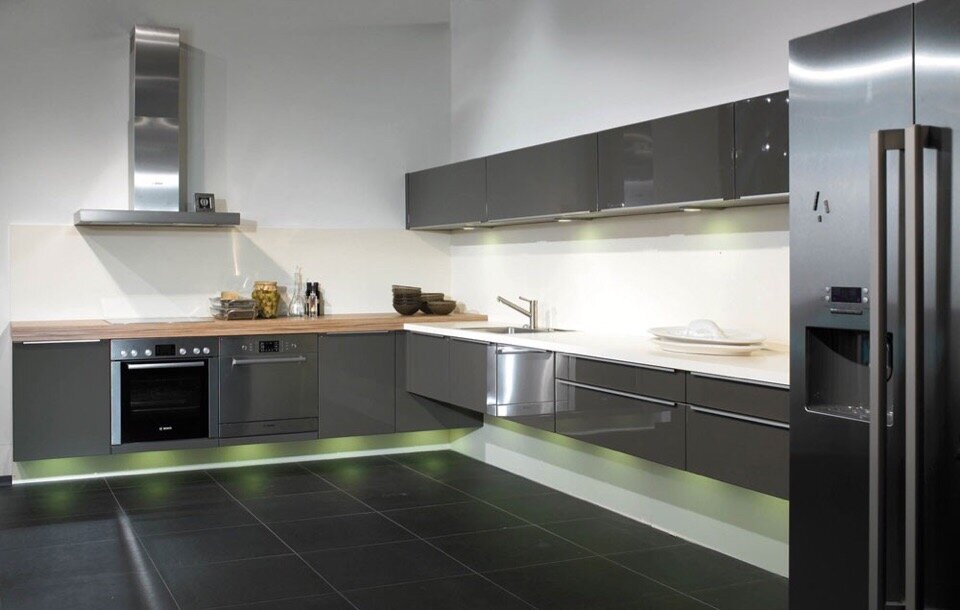 Подвесной кухонный гарнитур или как его еще называют бесцокольный – это кухня у которой отсутствует соприкосновение с полом. Расстояние от пола до нижних ящиков обычно составляет от 30 до 50 см. Такого рода кухни набирают обороты и особенно популярны для малогабаритных квартир, так как визуально облегчают кухонное пространство.