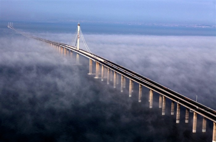 Самый большой мост в мире имеет протяженность 165 км (102 мили). Это Даньян-Куньшаньский виадук, который построили в 2011 году за рекордные три года. Только 9 км дороги располагаются над водой, а вся остальное — железная дорога, приподнятая над землей и протянувшаяся от Шанхая до Нанкина. Это самая длинная железнодорожная магистраль в мире на сегодняшний момент. Особенно впечатляюще мост выглядит на участке над озером Янчэн во время тумана. Кажется, что инженерное сооружение сошло с волшебной картинки и висит в воздухе. Даньян-Куньшаньский виадук Более 10 тысяч строителей двигались одновременно с разных берегов навстречу друг-другу. Полмиллиона тонн стали и 2,5 млн тонн бетона обошлись правительству Китая в 10 млрд долларов. Это самое масштабное сооружение в своей категории, занесенное в Книгу Рекордов, и продолжает оставаться таким вот уже несколько лет.