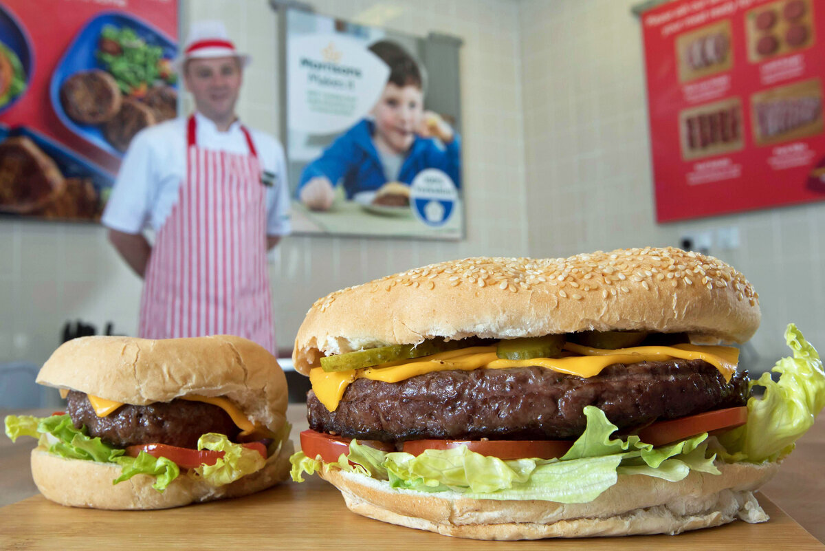 Популярная сеть английских супермаркетов Morrisons по большим праздникам предлагает проголодавшимся покупателям гигантский бургер. Бутерброд весом почти в полкило стоит три английских фунта стерлингов. Праздничный бургер от Morrisons Впервые мегабургер от Моррисонз был приготовлен на День отца в начале июня 2017 года. Блюдо имело успех, и на ближайший Национальный праздник бургеров (National Burger Day), который в Великобритании отмечают 25 августа, продуктовая сеть представила его как флагман меню Morrisons. Как известно, англичане — страстные любители футбола. Поэтому вес гигантского бургера приравнен к стандартному весу футбольного мяча — 1 фунт, это около 0.454 кг. Диаметр сэндвича — 18 см. Стоит бургер ровно как четыре классических четвертьфунтовых бутерброда Morrisons — три фунта стерлингов (это приблизительно 256 рублей). Состав не претерпел изменений: котлета из отборной говядины, овощи, сыр, салат, соус. В регулярном меню супербургера нет, его, как правило, в ограниченном коли