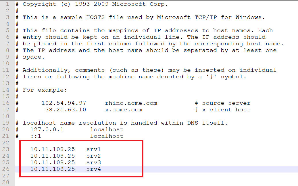 >FOR /L %I IN (1,1,100) DO ECHO 10.11.108.25 SRV%I >> C:\WINDOWS\SYSTEM32\DRIVERS\ETC\HOSTS