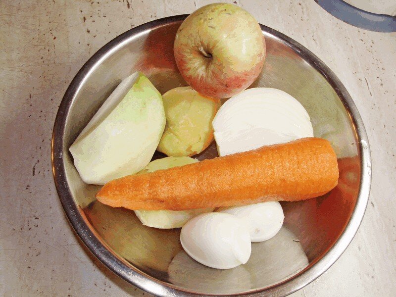 Соль, перец. Приготовление: Очищаем, отваренные за несколько часов до приготовления картофель и яйца. Чистим редьку, лук и морковку. Картофель трем на крупной терке, откладываем в сторону. Лук мелко режем и заливаем кипятком, чтобы убрать горечь. Через 10 минут сливаем воду и откладываем лук. Черную редьку натираем на мелкой терке, а если используем зеленую, то на средней. Мелко натираем морковь и убираем в сторону. Очищаем яблоко от кожуры и сразу натираем в крупную терку. Сбрызгивае