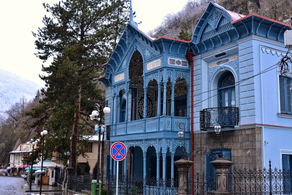 Всего в каких-то двадцати метрах от входа в главный парк Боржоми стоит красивое восточное здание цвета бирюзы. Туристы очень любят его фотографировать, уж больно оно выделяется на фоне остальных домов. У здания даже есть собственное имя — «Фирузе», что в переводе с персидского означает «бирюза».