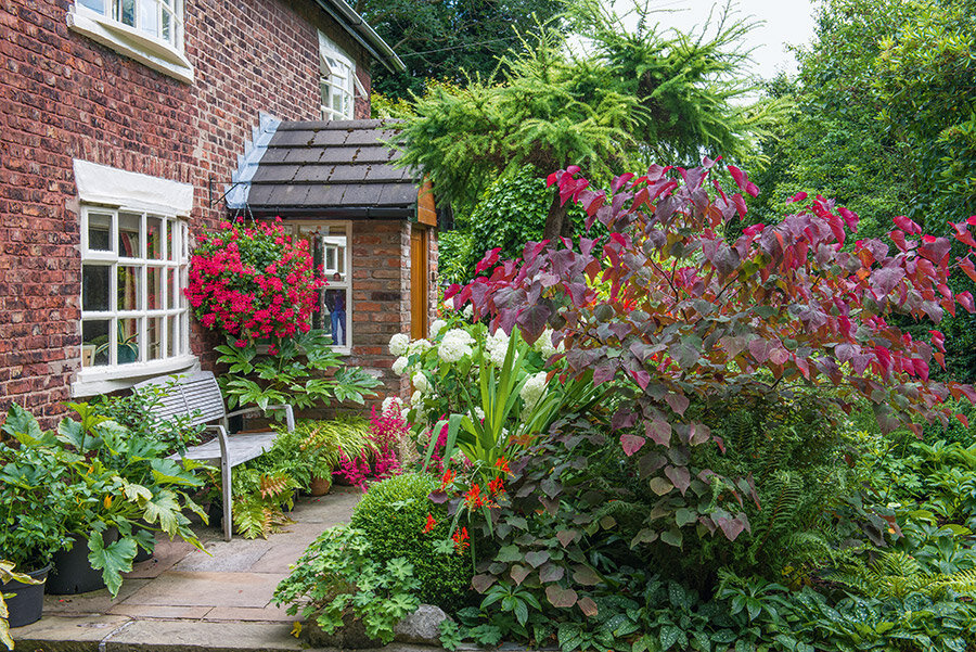 В июле торжествуют георгины, бордеры из травянистых многолетников, а астры и декоративные травы будут цвести даже осенью, когда сад перед домом озарится всполохами краснеющей листвы клена и багрянника. Зимой на первый план выходит структура: арка с плющом, вечнозеленые кустарники, шары из самшита и живые изгороди.