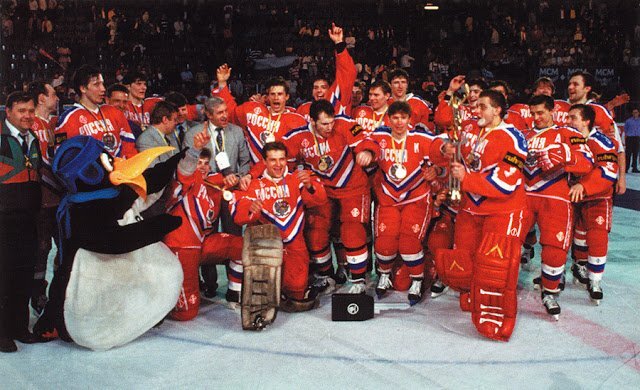 В этот день ровно 26 лет назад в Мюнхене состоялся финал 57-го чемпионата мира по хоккею, в котором встретились сборные России и Швеции. Путь подопечных Бориса Михайлова к финалу был, что называется, тернист и труден. На групповом этапе сборная России выступила отвратительно, проиграв шведам (2:5), канадцам (1:3) и оконфузившись с итальянцами (2:2). В плей-офф команда вышла с 3-го места и начала набирать обороты только во время матчей на вылет. В 1/4 финала были разгромлены хозяева турнира немцы (5:1), а в зрелищном полуфинале со счетом 7:4 была вынесена сборная Канады. В финале российскую сборную было уже не остановить. В первом периоде Герман Титов и Андрей Николишин установили комфортное преимущество в два шайбы, а во второй двадцатиминутке 32-летний Андрей Хомутов, впервые ставший чемпионом мира еще в 1981 году, в третий раз огорчил голкипера соперника. Шведы смогли лишь забить гол престижа ближе к концовке матча. 3:1 - победа команды Бориса Михайлова. И 2 мая 1993 года никому даж