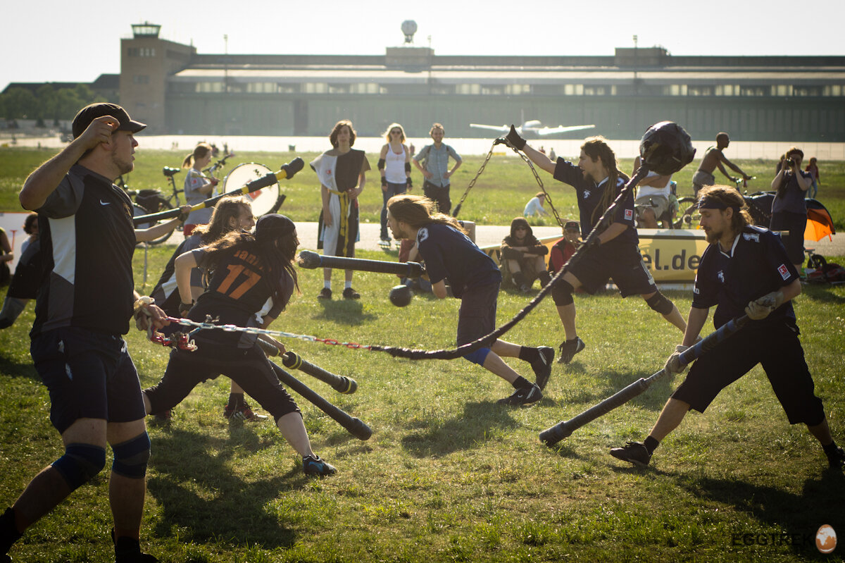 Металл при изготовлении оружия не допускается, кроме пряжки на ремнях для щита.