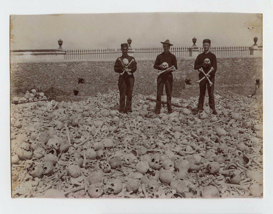 Американские солдаты с человеческими черепами на кладбище Колоне в Гаване, Куба, 1900-02 г.