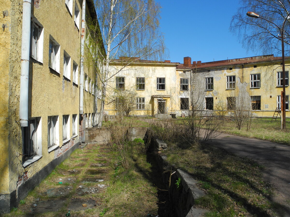 В Высоцке — крошечном городе с населением чуть больше тысячи человек, в 40 минутах езды от Выборга — на Ленинской улице, 1, обнаружили заброшенное функционалистское здание. Впрочем, судя по этой заметке, от финнов тут только трехэтажная часть (1935 г.п.), а двухэтажную — с арками в коридорах и высоченными потолками (обитатели комнат не выдерживали пространственной роскоши и строили полати) — добавили уже в 1950-е. Автор заметки пишет, что это был «кадетский корпус, который переделали под штаб дивизиона, а потом под офицерское семейное общежитие»; его расселили в 2015 году. Планировка — коридорного типа; удобства мы нашли лишь на первом этаже. В комнатах — останки былого быта: продавленные диваны и беззубые пианино, детские рисунки и засохшие цветы, тюлевые занавески и битые плафоны.