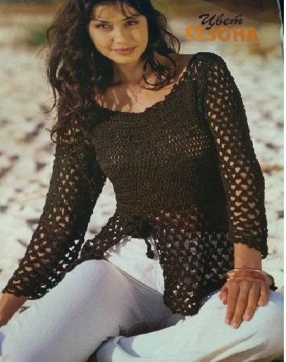 Ажурный пуловер связанный крючком послужит украшением для представительниц женского пола. Он нежный и изящный благодаря рисунку из воздушных петель. Красиво выполнена горловина изделия, она подчеркнет изгиб шеи. Пуловер украшает цветок на поясе придавая фигуре женственности. Простое описание работы, предоставленная схема и выкройка поможет вам выполнить работу без особых трудностей. Вам потребуется: 450 (500) 550 г коричневой пряжи Goby (65% хлопка, 35% вискозы); крючок № 4,5. Плотность вязания Основной узор: 13 п. и 7,5 р. = 10 Х 10 см. Ажурный узор: 13 наборных п. и 6, 5 р. = 10 Х 10 см. Основной узор - столбики с накидом. Первый ст. с/н каждого ряда заменяют на 3 воздушные петли подъема. Ажурный узор Набрать количество петель кратных 3 + 1 + 1 воздушная петля подъема. Вязать по схеме приведенной ниже. Каждый ряд начинать с одной или трех воздушных петель подъема (вместо 1-го ст. б/н или 1-го ст. с/н и петель перед рапортом). Рапорт повторять до конца вязки. Заканчивать петлями п