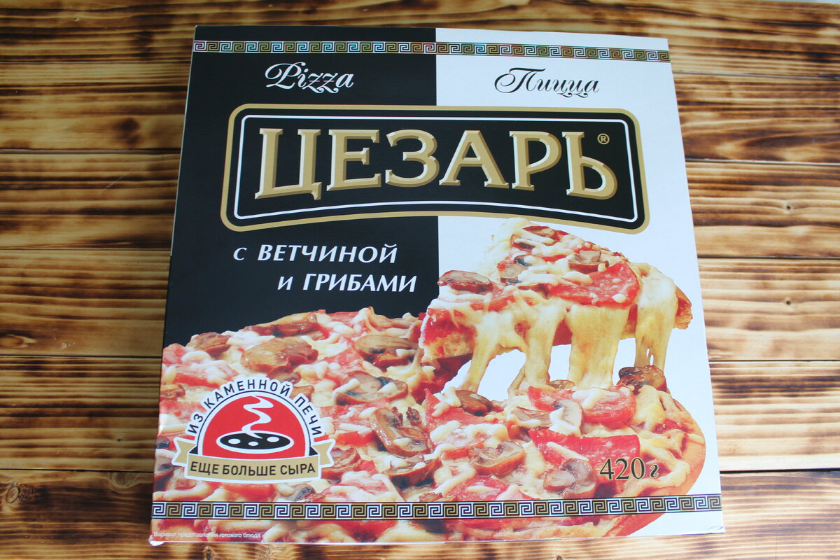 Привет! Недавно в Магните, наткнулся на замороженную пиццу по весьма привлекательной цене в 149 рублей за 420 грамм. Пиццы такого веса в пиццериях стоят как минимум в 2 раза дороже. Никогда ранее не покупал замороженные полуфабрикаты данного типа в магазинах, считал что ничего хорошего в них нет. В этот раз любопытство и голод подтолкнули меня к покупке. Итак, посмотрим, не выбросил ли я деньги на ветер. Пицца с ветчиной и грибами под торговой маркой "Цезарь". Упакована пицца в картонную коробку, похвально, многие другие производители упаковывают просто в пленку. Производитель неоднократно завоевывал золотые медали на выставках и конкурсах, это обнадеживает, будем надеяться что перед нами действительно хороший продукт. Изготовитель ООО "Морозко". Произведено в городе Бронницы Московской области. Состав очень длинный, перечислять очень долго, скажу лишь что особо криминального ничего нет, разве что в тесте и начинке есть загустители и красители, да в составе ветчины содержится соевый бе