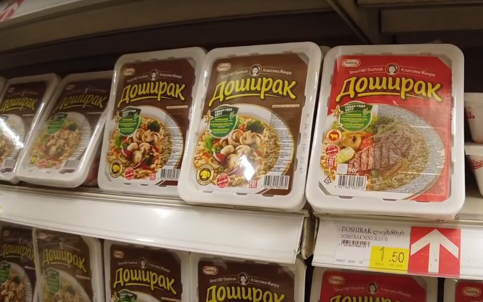 Всем привет! Сегодня я вам расскажу и покажу, что продается и сколько стоит в грузинском супермаркете города Тбилиси. Кстати, в Грузии национальная денежная валюта называется лари и если 1 лари конвертировать в рубли, то получим 23 рубля 16 копеек. Давайте я начну свое путешествие по супермаркету с цен на всем известную лапшу, которая спасает от голода студентов и обычных работяг. 1 пачка стоит 1,5 лари (35 рублей). Вообще, на полках грузинских магазин очень много известных брендов.