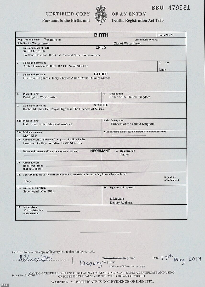 И все-таки официальное свидетельство о рождении ребенка принца Гарри было обнародовано. Документ оформлен в том же стиле, что и свидетельство о рождении принца Луи, то есть напечатан. В то время, как документы о рождении принца Джорджа и принцессы Шарлотты были написаны от руки, и были высмеяны общественностью за плохой почерк составителя. Почерк, прямо скажем, и правда, не очень. Но рассмотрим свидетельство о рождении Арчи - а именно так зовут все-таки королевского ребенка, а вовсе не Арчибальд, например, что было бы, на наш взгляд, более подходящим именем. Во-первых, подтверждено официально, что именно в больнице родился ребенок, то есть мечты Меган о домашних родах не осуществились. Во-вторых, выясняется, что Меган все-таки зовут Рэйчел - это ее первое имя. А также то, что она называет себя принцессой. И вот тут разгорелись основные баталии. Британцам не понравилось, что Меган назвала себя принцессой Соединенного Королевства. Да, после вступления в брак с принцем Гарри она получила