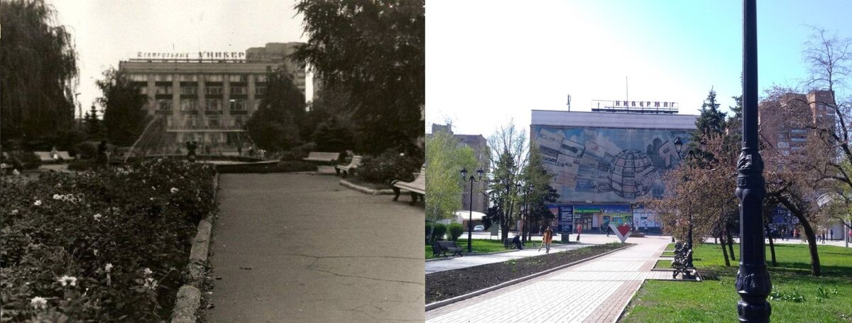 На просторах интернета узрел старое фото из центра города. На нем наш ЦУМ запечатлен, и скверик, который перед ним. Открытием для меня стало наличие фонтана в скверике, сейчас его нет. Вспомнил, что в конце апреля я, сидя на лавочке в том скверике, в ожидании заказчика, сделал телефоном пару фотографий, так что давайте сравним, что было тогда, и что есть сейчас. Здание ЦУМа по-прежнему на месте, но функционирует только первый этаж. Всё остальное с ноября 2008 года разрушено. В ноябре 2008 года был пожар в универмаге, его долго не могли потушить. Штатная система пожаротушения там не работала, а из-за проблем с водой в городе пожарные долго не могли найти функционирующие гидранты, воду подвозили своими цистернами, которые опустошались за пару минут. Впоследствии здание вроде было признано непригодным к восстановлению, затем вроде проводились повторные исследования, согласно которых специалисты пришли к выводу, что восстановить здание всё-таки можно, если заменить там часть металл