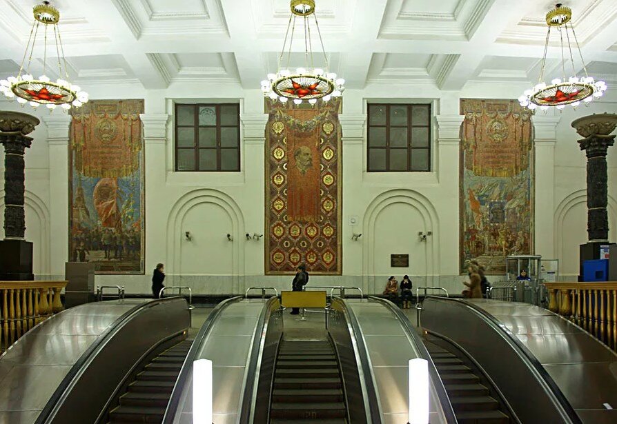 В статье о мозаиках станции московского метро Комсомольская-Кольцевая мы начали тему об их судьбе в эпоху десталинизации. Здесь поговорим о станции Добрынинская (до 1961 г. — Серпуховская"). Наземный вестибюль станции украшен мозаичным триптихом, созданным к 1 мая 1951 г. по эскизам художников Г. Рублева и М. Иорданского в мастерской Академии художеств в Ленинграде. На левой части триптиха, изображавшего военный парад солдаты несут знамя на котором был изображен двойной профиль Ленина-Сталина, который был заменен на гвардейский знак, причем очень грубо и заметно. На правой — люди несли портрет Сталина: В 1960-е он был заменен на портрет Гагарина: Подземный зал украшали 16 барельефов на тему труда, а в торце зала — барельеф Сталина: В 1967-м его уберут и заменят на мозаику "Утро космической эры": Если вам понравился материал — подписывайтесь на наш канал. Заходите на наш сайт www.gudmosaic.ru, где вы сможете увидеть больше работ нашей мастерской. Все вопросы можно задать по телефону