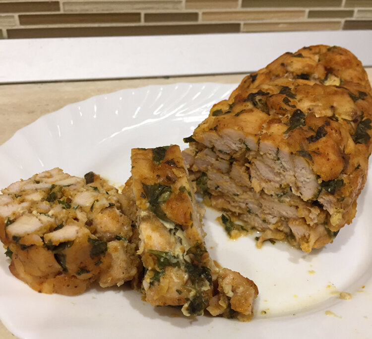 Доброго времени суток, худеющие! Сегодня я познакомлю вас с приготовлением куриного филе очень простым способом. Куриный рулет можно есть на обед с гарниром, на ужин с овощами, а на завтрак положить на хлеб вместо колбасы))). Итак, нам понадобится : Куриное филе ( у меня 0,5 кг, можно больше, можно меньше, здесь не принципиально),зелень, чеснок, желатин. А так же пакет для запекания. Приготовление. Куриное филе режем кубиками, зелень тоже измельчаем. У меня из зелени петрушка и лук, но лучше взять петрушку и укроп. К мясу добавляем зелень, специи, чеснок ( выдавливаем через пресс),желатин. Желатин сыпем сухой, разводить его не нужно. Всё перемешиваем. Далее нужно положить наше мясо в пакет для запекания или рукав, туго перетянув и завязав. Если у вас рукав, завяжите с двух сторон (как конфетку). Чем туже вы перетянете, тем будет лучше. Выпекать при температуре 180 градусов около 50 минут. За 5-10 минут пакет разрезать, чтобы у рулета получилась аппетитная корочка. Наш рулет готов).